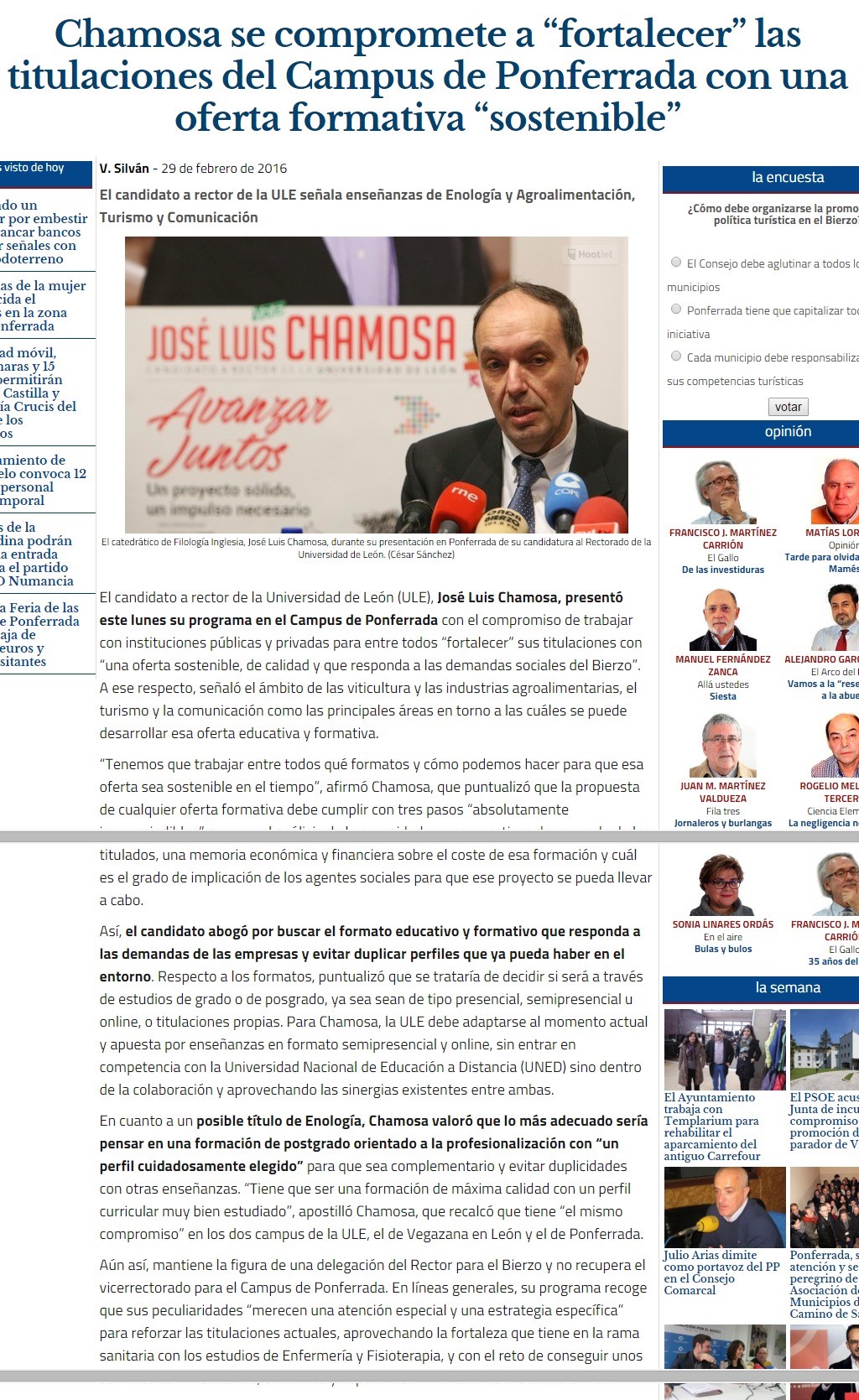 Chamosa se compromete a fortalecer las titulaciones del Campus de Ponferrada con una oferta formativa sostenible Administrador En Prensa 03/03/2016