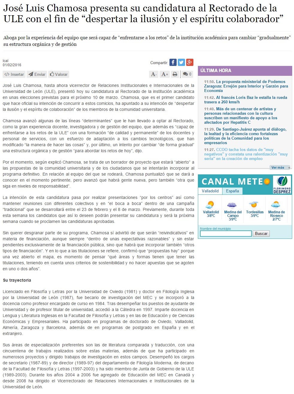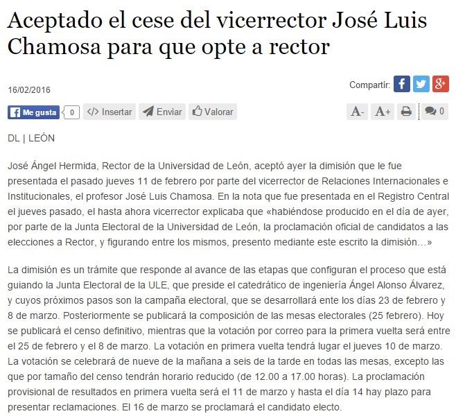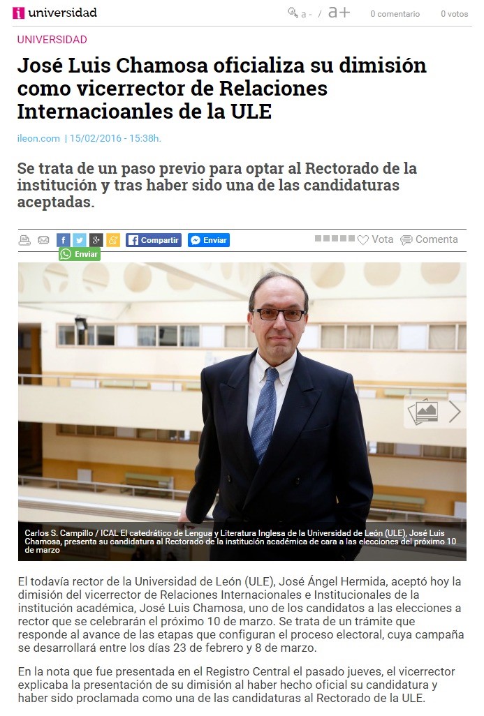 Chamosa plantea una campaña electoral al rectorado de la ULE desde la veracidad y la transparencia y con un mensaje unico En Prensa 03/03/2016