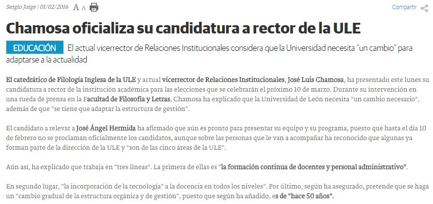 Chamosa plantea una campaña electoral al rectorado de la ULE desde la veracidad y la transparencia y con un mensaje unico En Prensa 03/03/2016