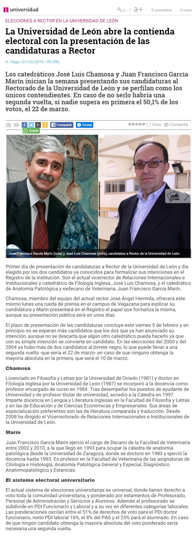 Chamosa y Marín ya son candidatos oficiales al rectorado de la Universidad de Leon Administrador En Prensa 03/03/2016