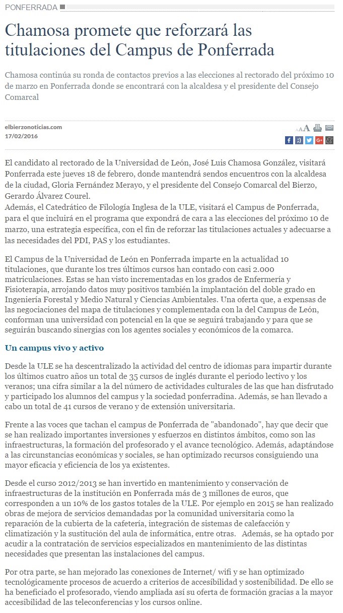 Chamosa plantea una campaña electoral al rectorado de la ULE desde la veracidad y la transparencia y con un mensaje unico En Prensa 03/03/2016